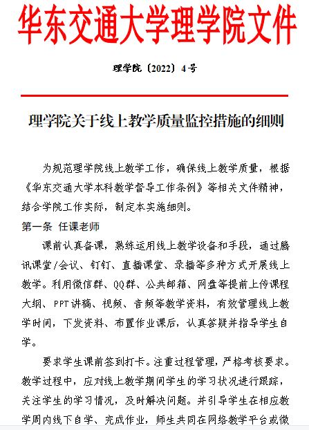 为规范永利3044集团线上教学工作,确保线上教学质量,根据《304永利集团本科教学督导工作条例》等相关文件精神,结合学院工作实际,出台了《永利3044集团关于线上教学质量监控措施的细则》,从任课教师、学生、课程负责人、学院督导组、辅导员、教学信息员、教务管理工作人员等方面明确在当前疫情期间线上教学的注意事项和操作细则,做到“守好责任田、护好一段渠”,实现线下线上教学无缝对接。