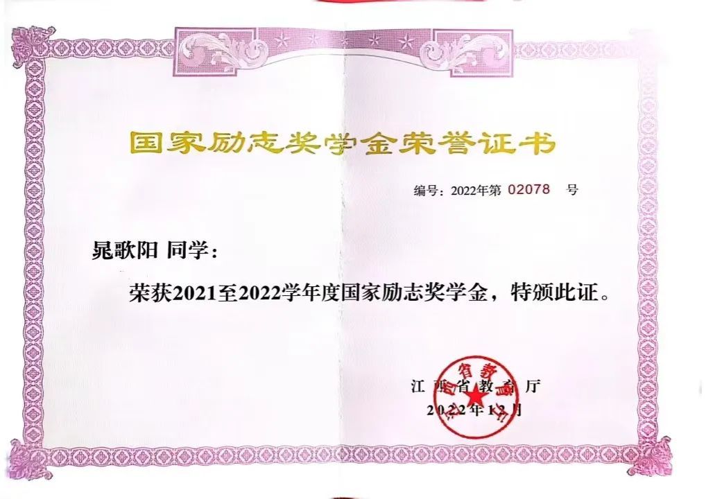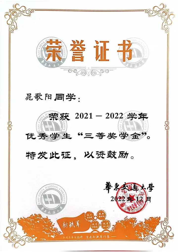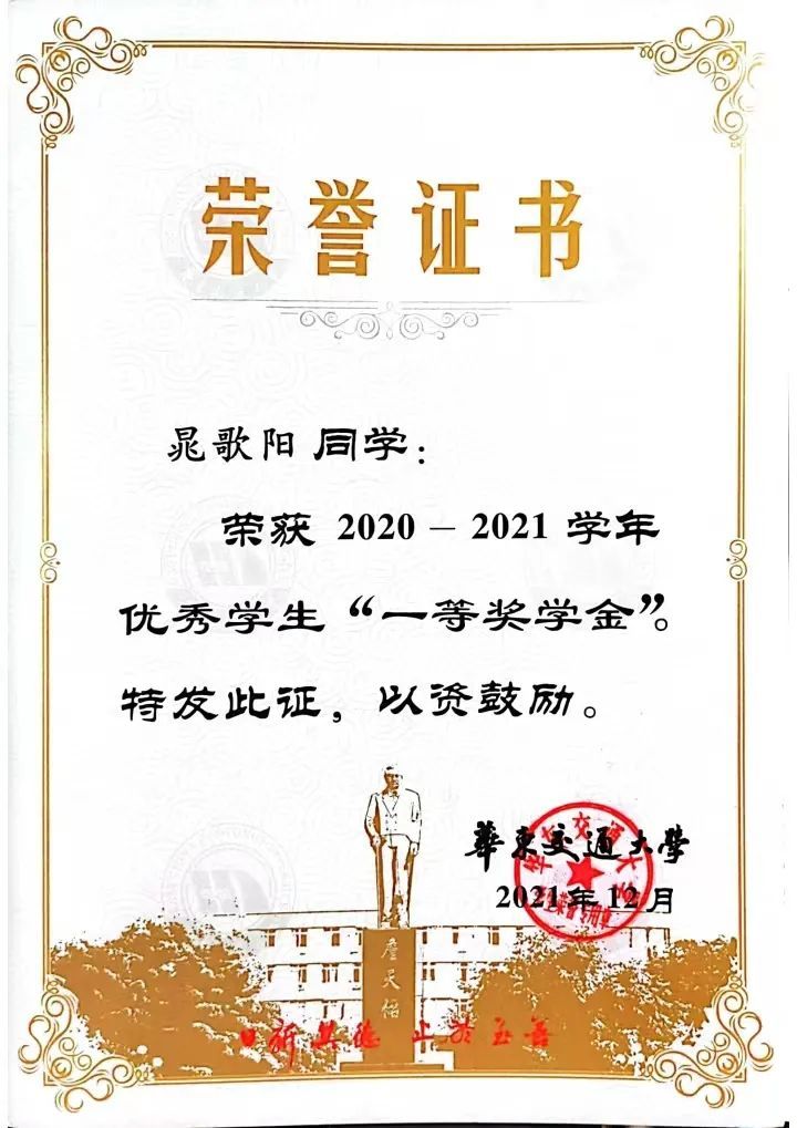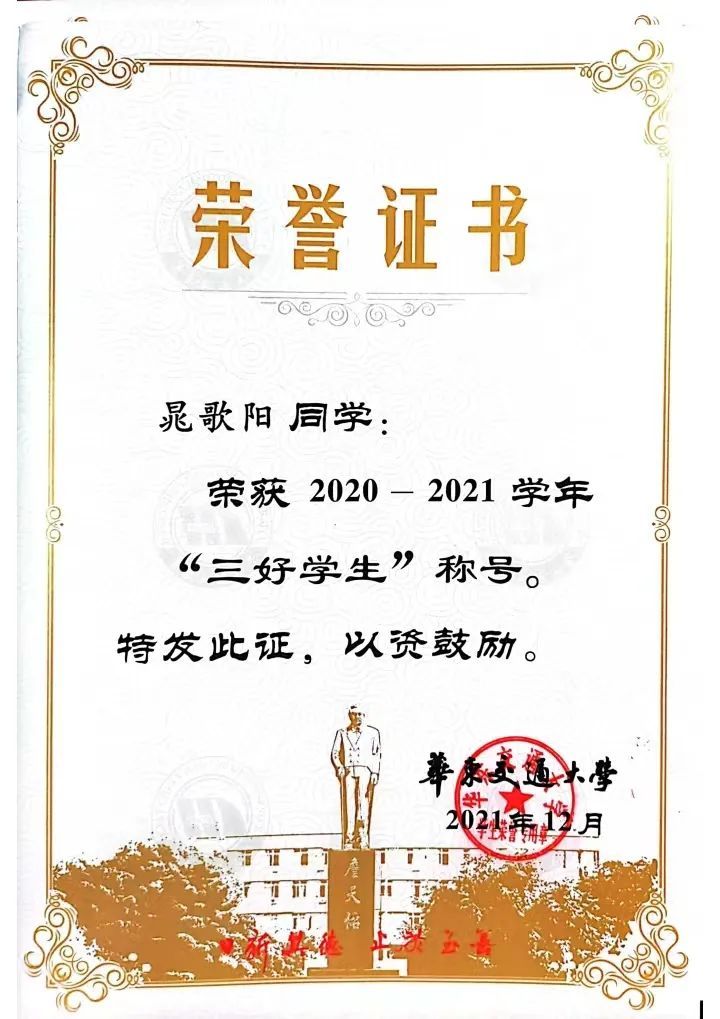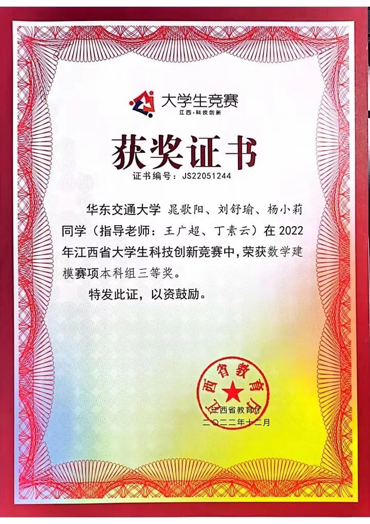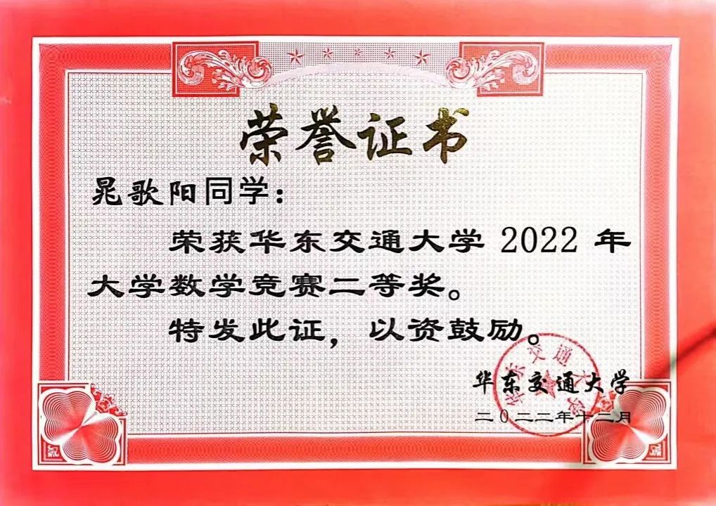 20级信息技术2班晁歌阳,获得2020-2021学年一等奖学金、三好学生;2021-2022学年三等奖学金、国家励志奖学金;2022-2023学年特等奖学金、国家励志奖学金、自强奖学金,2022年江西省大学生科技创新竞赛(数学建模)三等奖,第十二届亚太地区大学生数学建模竞赛三等奖,2022年304永利集团数学竞赛二等奖。