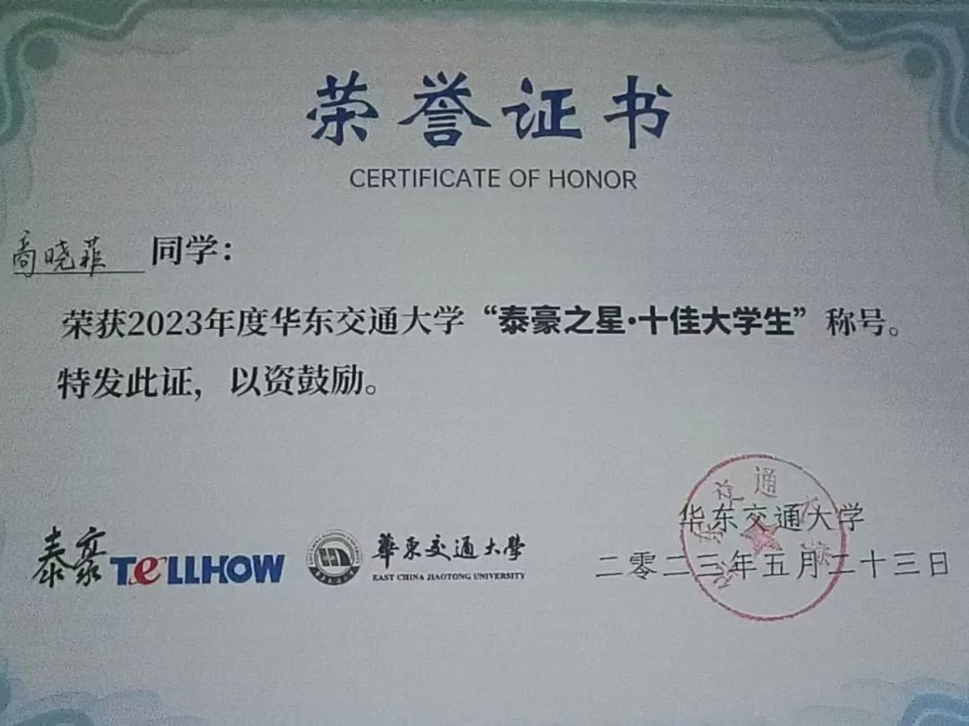 2023年获“泰豪之星·十佳大学生”称号(全校仅十个)