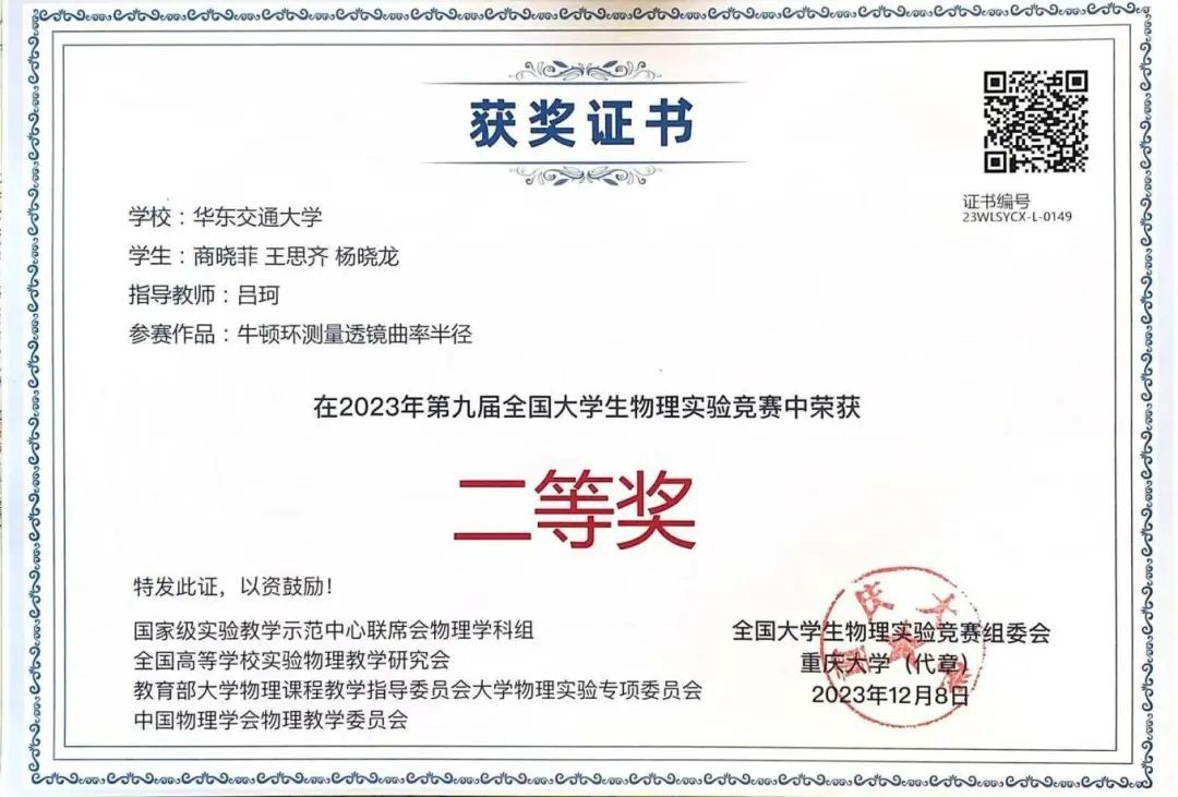 第九届全国大学生物理竞赛二等奖,国家级创新创业训练项目,校三好学生,优秀班干部,志愿公益奖等。
