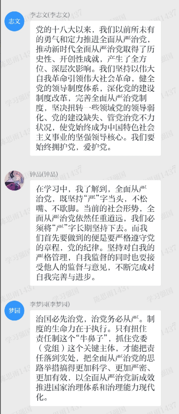 本次党内学习,我们在家中进行了集中线上讨论,得益于学习强国app,借此机会,我进一步了解到党的纪律是多方面的,但政治纪律是最重要、最根本、最关键的纪律,遵守党的政治纪律是遵守党的全部纪律的重要基础。组织纪律是辨别一个组织好坏的最直观的依据,如若能做到人人守纪律,纪律时刻放心中,那我们的组织一定可以日益强大,强己以兴国!