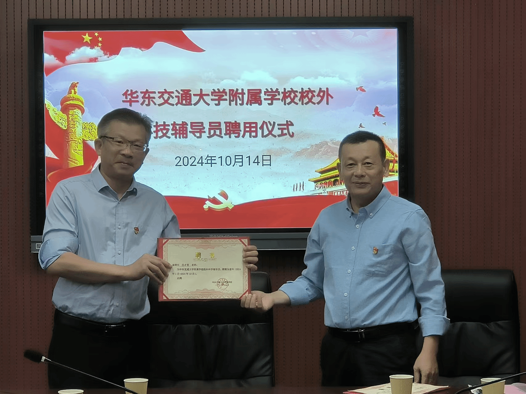 永利3044集团党委和附属学校党总支共同签订党建共建协议,并由附属学校为永利3044集团选派的优秀党员教师颁发课外兼职科技辅导员聘书。