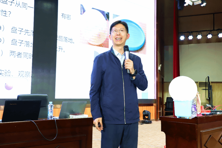 讲座中,刘志敏教授以“盆子与气球同时下落谁先着地”“转动惯量如何影响身体转动惯性”等贴近生活的物理现象为切入点,通过提问互动的方式迅速点燃现场气氛。同学们积极参与讨论,课堂上不时爆发出热烈的掌声和惊叹声。随后,科普团队成员运用生动形象的案例,将伯努利原理、电磁感应等抽象物理概念转化为通俗易懂的知识讲解。针对当前雷电高发的季节特点,团队还专门增设防雷电知识科普环节,结合避雷针工作原理,详细讲解了雷电天气的安全防护措施。