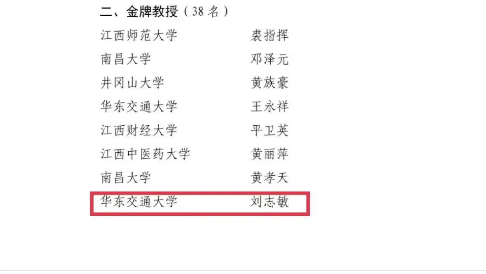 江西普通高校金牌教师(教学名师)推选活动旨在贯彻落实全国、全省教育大会和全国、全省普通高校本科教育工作会议精神,全面落实立德树人根本任务,牢固树立教学中心地位,激发广大教师以生为本,切实承担起教书育人使命。根据省教育厅、省教育工会《关干公布第二届江西普通高校金牌教师(教学名师)入选名单的通知》,在校级推选的基础上,经外省专家评审和审核公示等环节,我院刘志敏老师入选金牌教授。