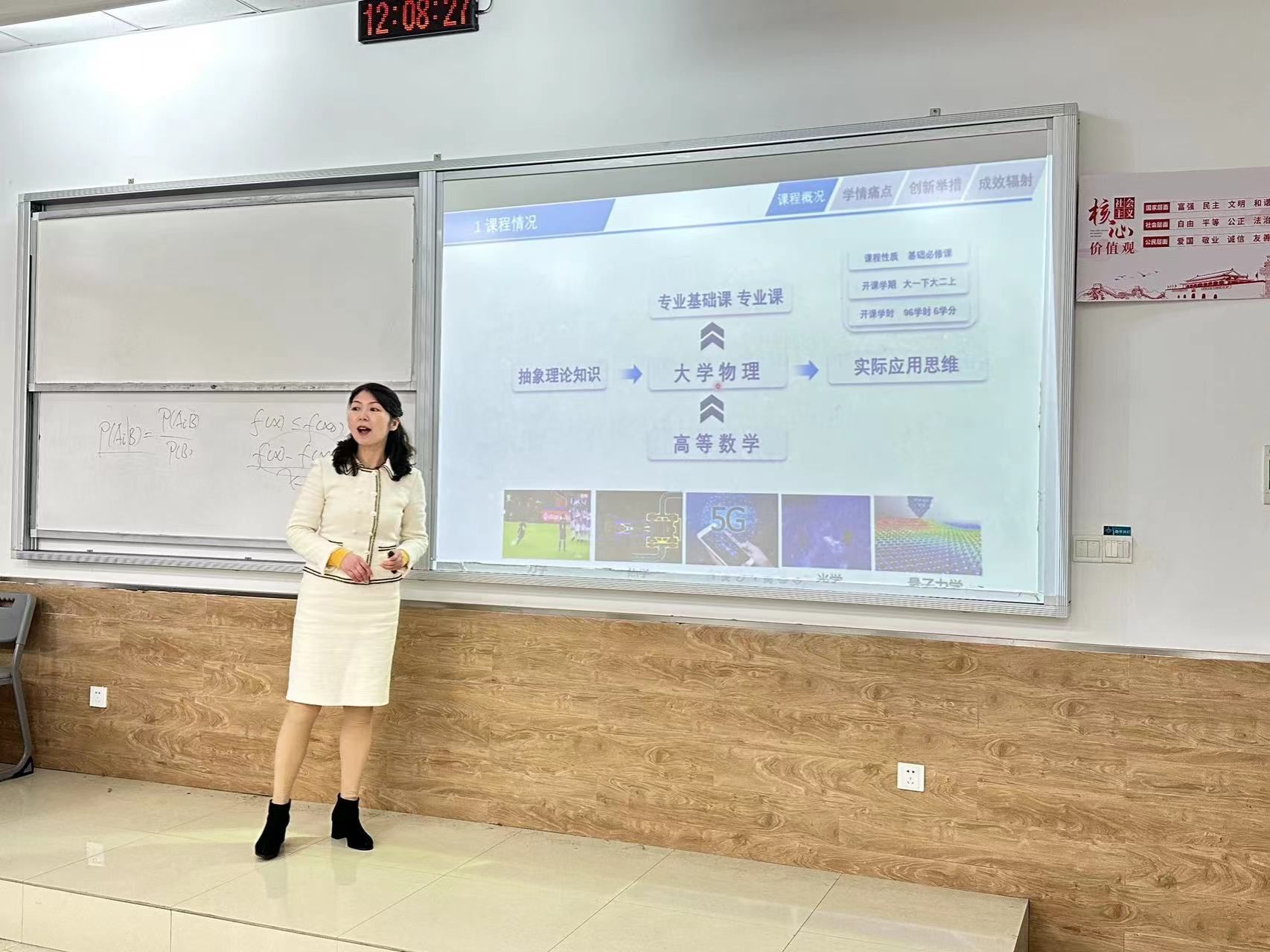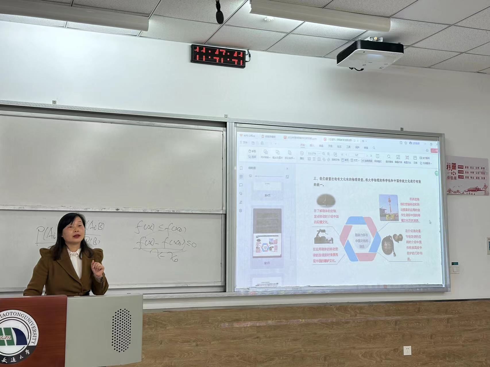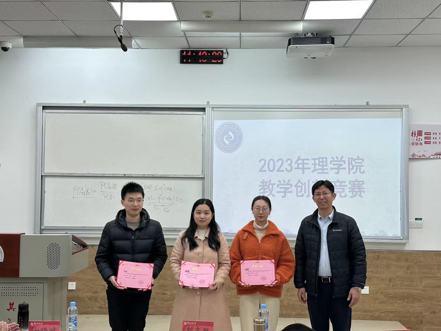 比赛阶段,十位青年教师分别就自己的主讲课程进行了教学演示,内容涵盖高等数学、大学物理、土木工程制图等基础课程。十位教师准备充分,教态自然,充分展现了我院青年教师的风采。付仂老师讲解《组合体投影的阅读》时,首先用动画的形式展示组合体的投影效果,其次用轻松诙谐的语气引领大家思考问题,最后剥开晦涩难懂的知识外壳,成功带领大家到达真理的彼岸。王睿媛老师讲解《贝叶斯公式》时,则是引用了“烽火戏诸侯”的典故,通过如何用概率知识解释周幽王信用度下降的问题来切入正题,牢牢把握住了趣味教学的精神内核。刘梦可老师讲解《微分中值定理》时采用PPT与板书相结合的模式,由知识解析到例题讲解,带领大家思接千载、徜徉瀚海,完成了与数学的心灵碰撞和深度理解。其他几位教师从课堂理念、重难点设定、细节把握、视角铨选、板书设计等层面进行讲述,各有所长。