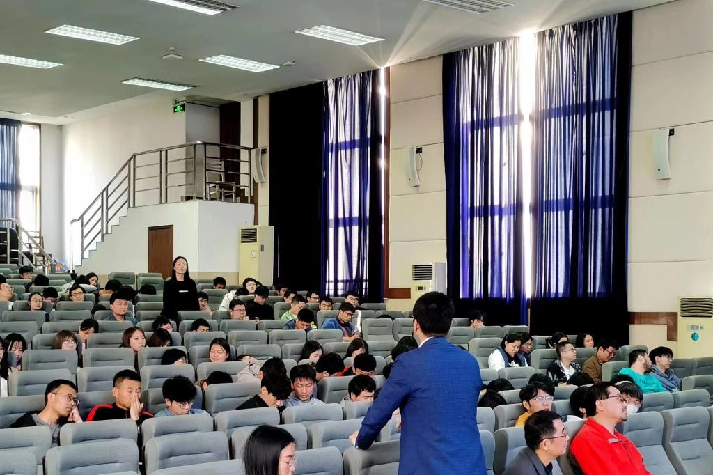 最后,会议进行互动提问环节,对接会上有不少学生被董大庆老师招聘宣讲吸引,其中薛婧雯同学在会议上询问招聘要求,董老师都给予耐心回答与指导。