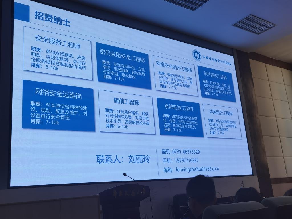 会上,董大庆向大家介绍了江西省网络安全研究院的发展历程、单位性质、宗旨和业务范围,让大家认识到省网络安全研究院在全省网络安全技术和标准,网络安全技术保障,保密科技发展和信息安全测评等方面的独特优势。展示了近年研究院获得的重大荣誉以及研究院科学技术团队的硬实力,随后进行2023年度江西省保密研究院招聘宣讲,介绍了安全服务工程师、售前工程师、网络安全测评工程师、体系运行工程师等岗位性质和要求,欢迎广大毕业生加盟。